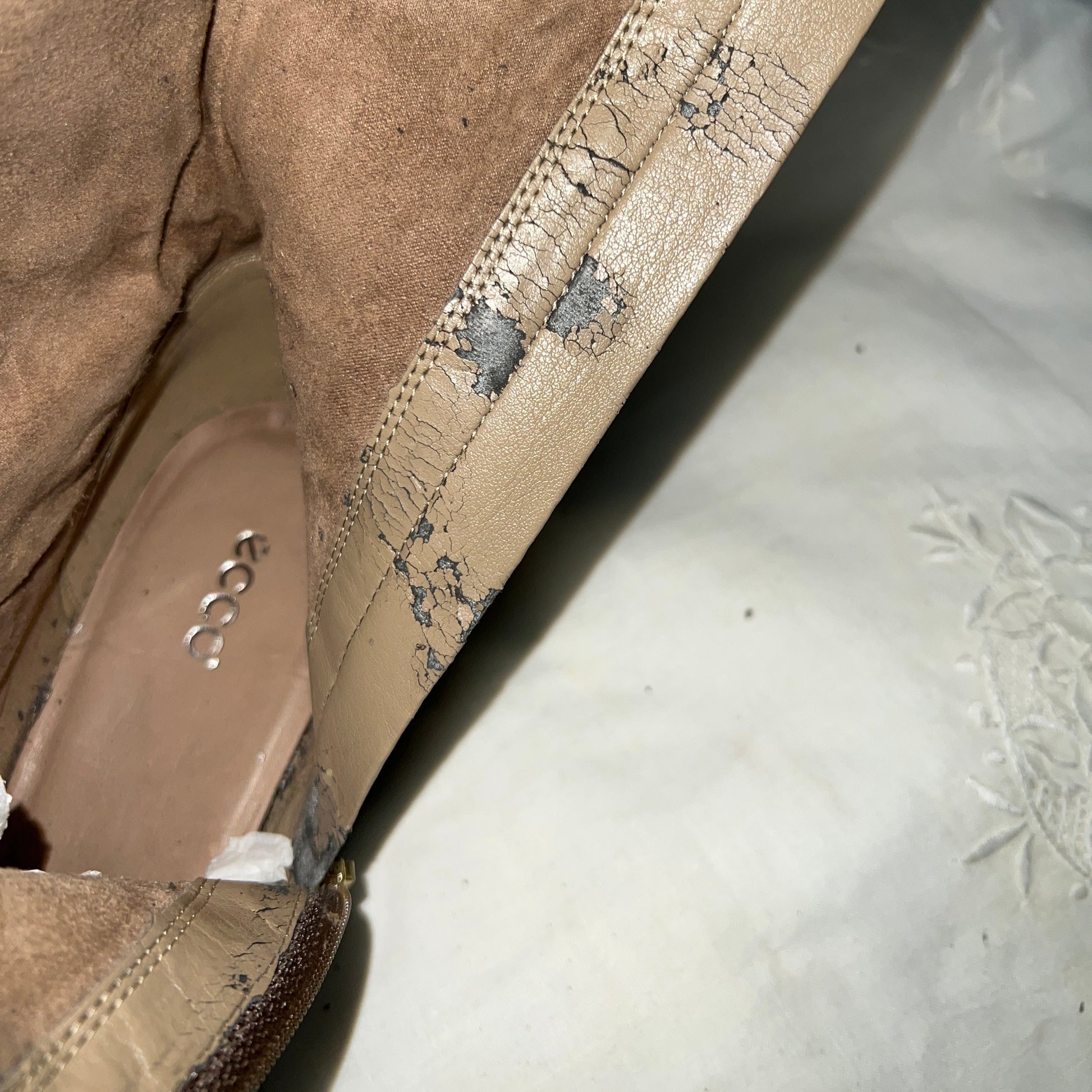 There is a small branding hole in the uppers of both boots (as pictured). This was marked by ecco to void the manufacturer's warranty and to prevent store returns to ecco.