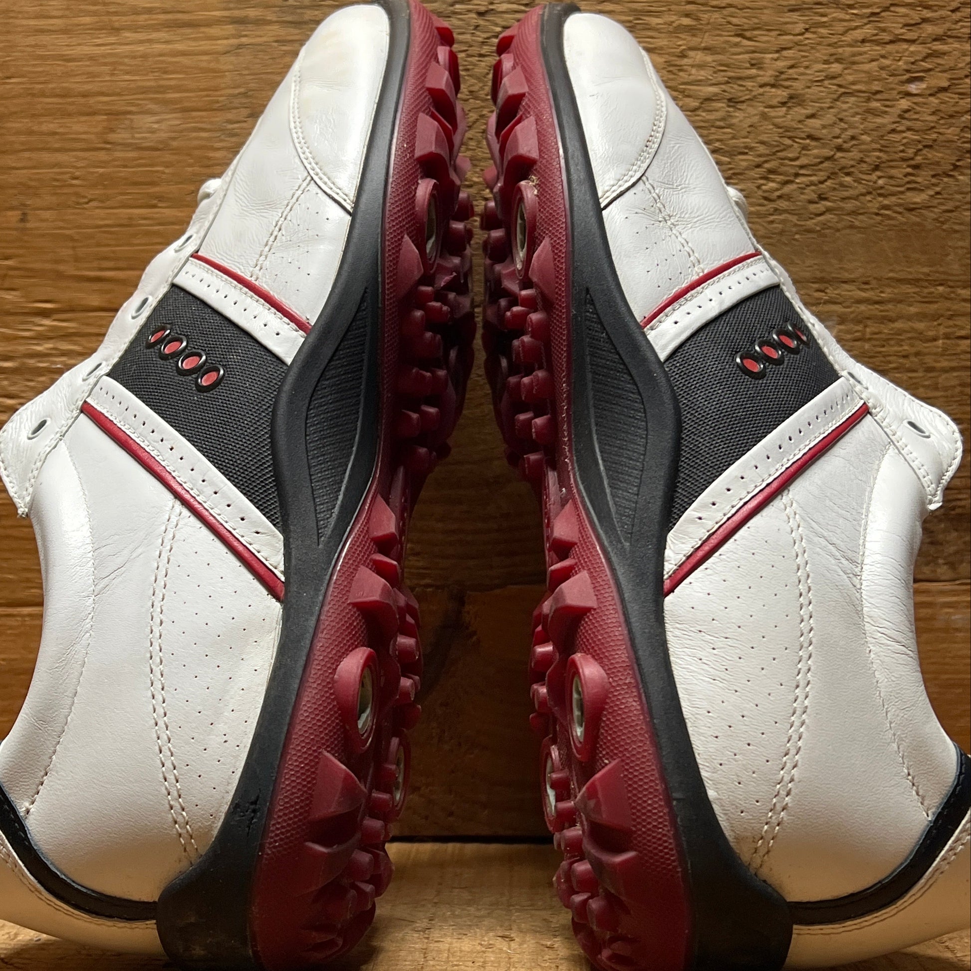 Men’s Ecco Hydomax Cleated Golf Shoe •White/Black/Red Hjydromax Leather • Size 46