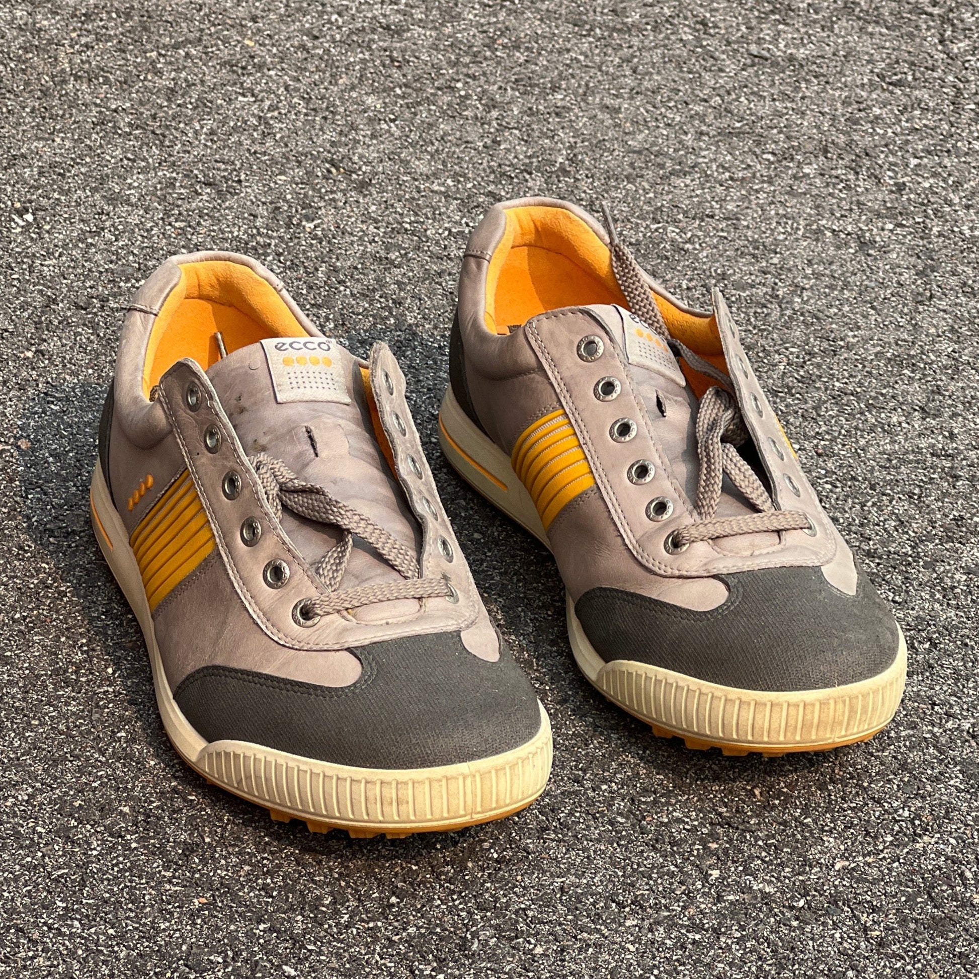 Step up your game with these preowned Men’s Ecco Street Premier Cleat-less Golf Shoes in stylish grey and citron leather, size 45EU. They’re in great shape with just a few light scuffs or stains—no rips, tears, or damage to slow you down on the course!