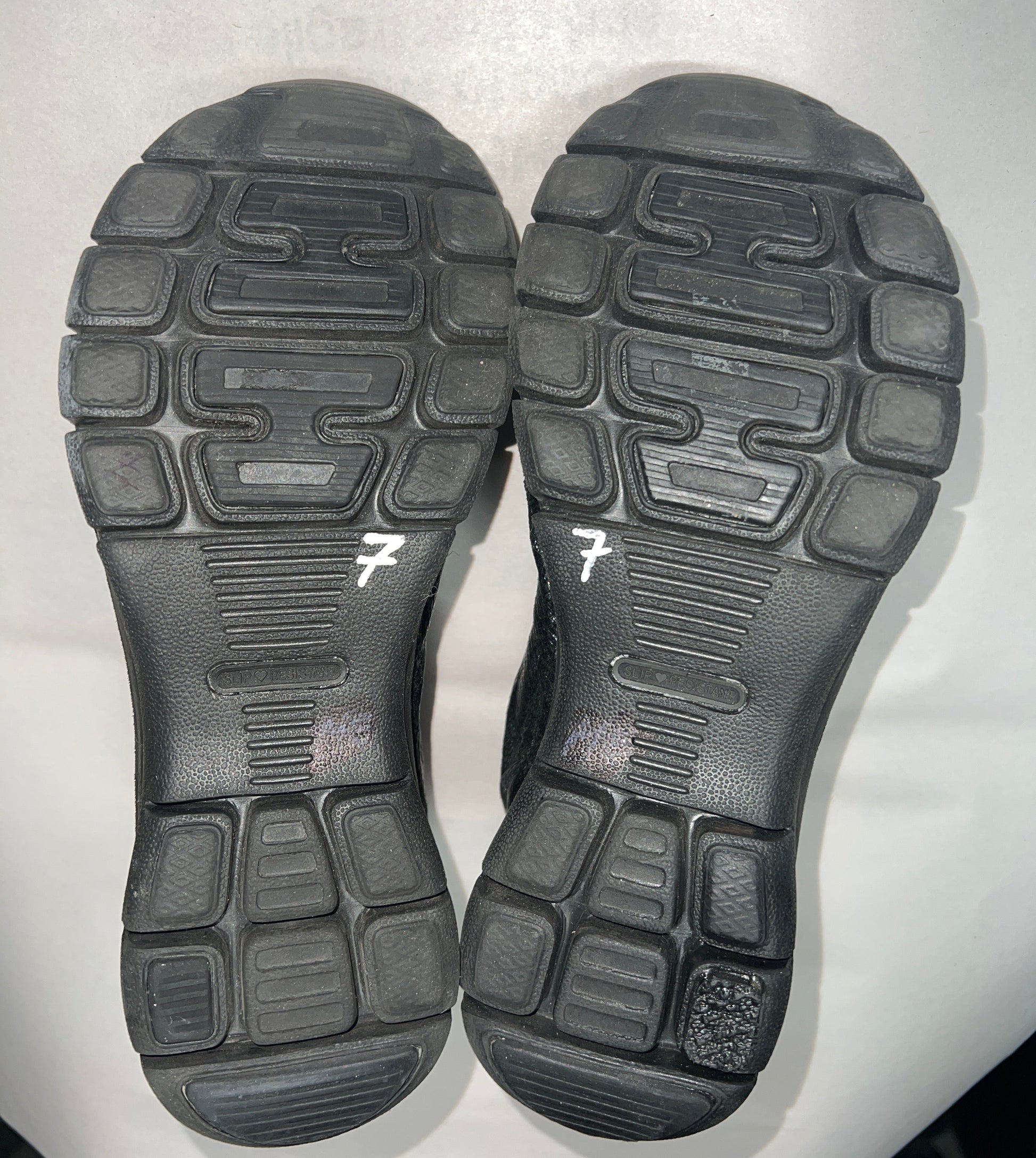 Traction plug on outsole heel of left shoe has been replace